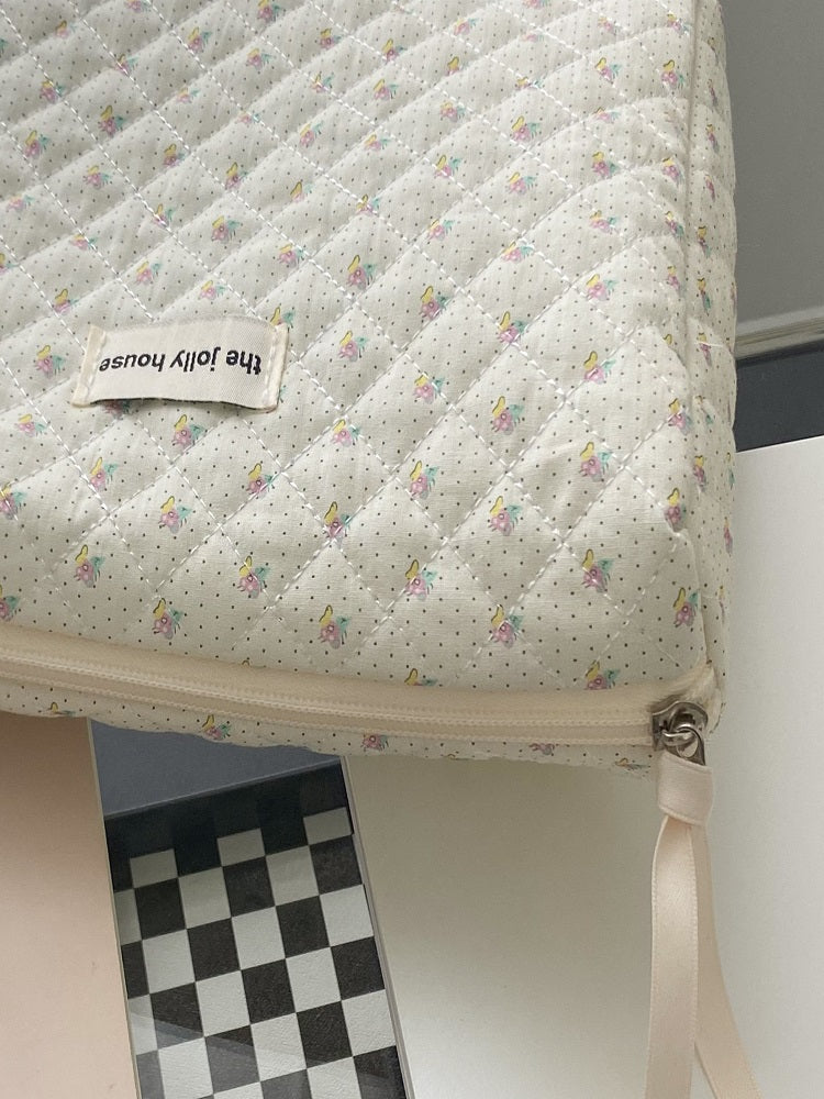 "Adorned with delicate floral prints, this makeup bag exudes a whimsical and feminine vibe."