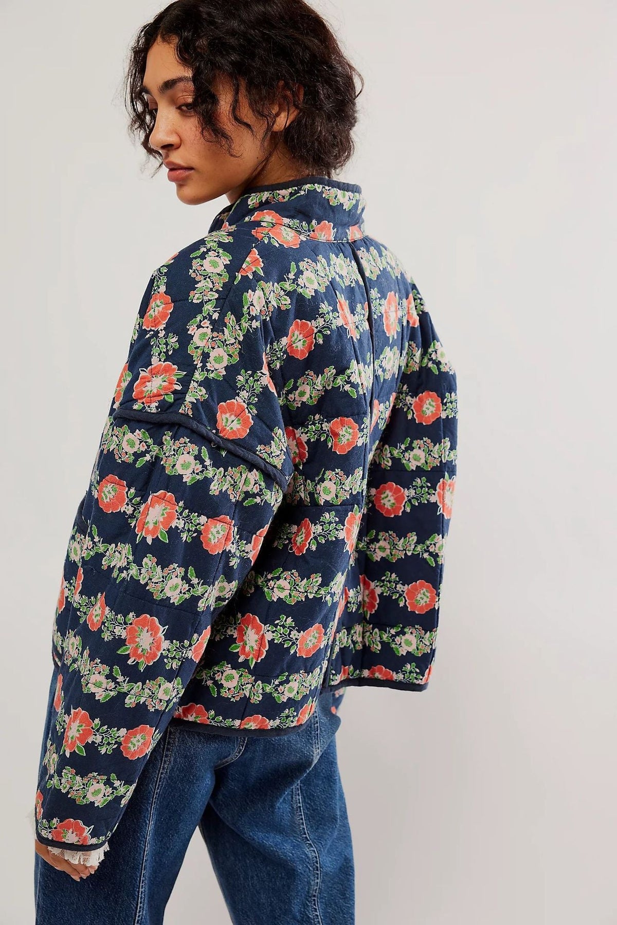 Flower Print Pocket Clip Cotton Drop Shoulder Jacket