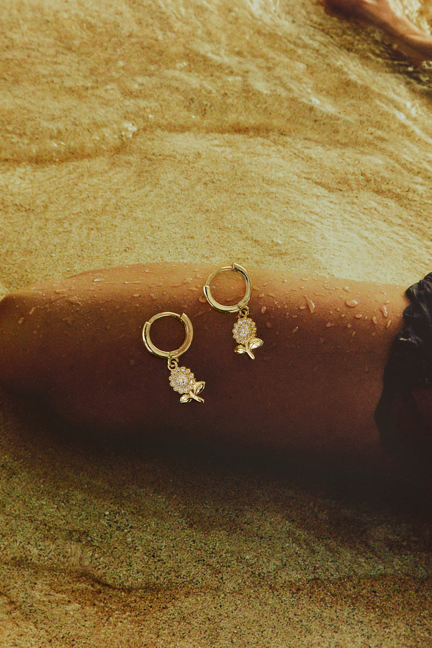 Be as beautiful as Opalescent Roses with these maginificent earrings. Created with a small rose shaped drop on a gold hoop - making it ideal for every elegant night out!