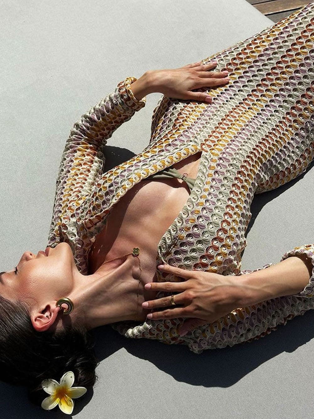 Transport yourself to the carefree ambiance of a vacation with our boho chic style crochet dresses for women. This collared maxi dress in our boutique encapsulates the easygoing and cheerful holiday vibe, offering a blend of chic style and relaxed comfort. The collared V neck and alluring keyhole cutout create an air of playful sophistication, complemented by the whimsical wavy striped crochet design and charming split sides, allowing you to revel in the soothing beach breeze. Experience the pure delight of a stylish and carefree escape as you unwind in this delightful and free-spirited vacation outfit.