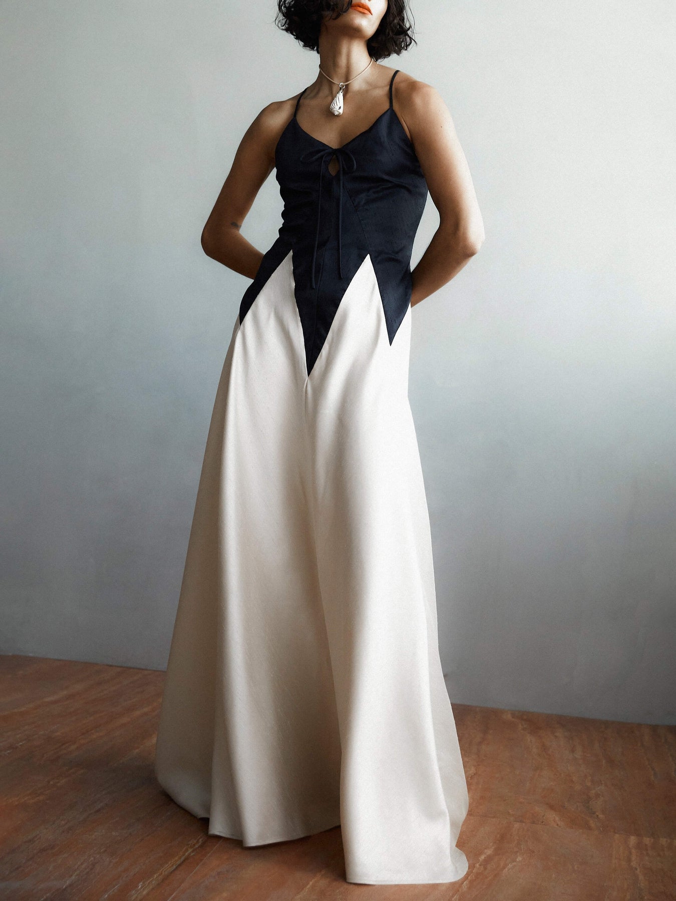 Combining contrasting colors with eye-catching details. this dress is a statement piece with adjustable straps for a personalized fit and added style.